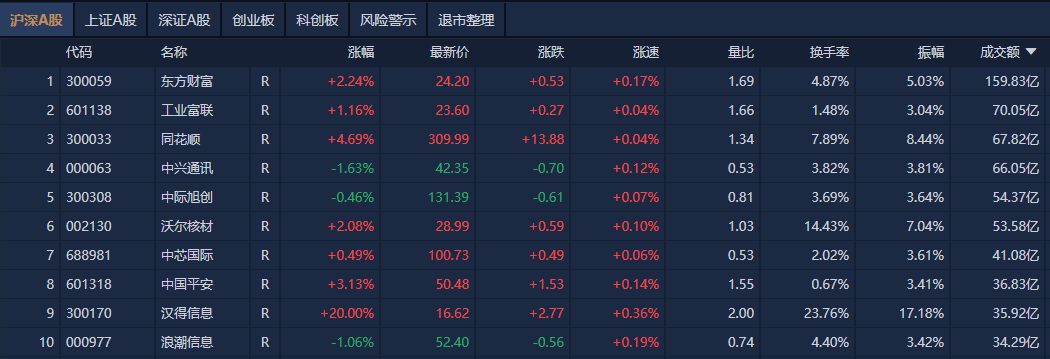 沪深两市半日成交额9094亿元,较上个交易日放量1754亿元。个股方面,南财金融终端显示,东方财富成交额超159亿元居首,工业富联、同花顺、中兴通讯成交额靠前。